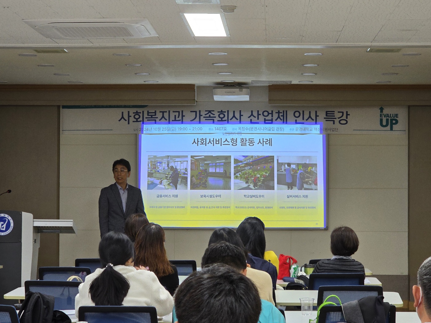 2024년 10월 25일 2학년 재학생을 대상으로 문경시니어클럽 옥정수 관장님 초청 가족회사 인사초청 특강을 실시했다.