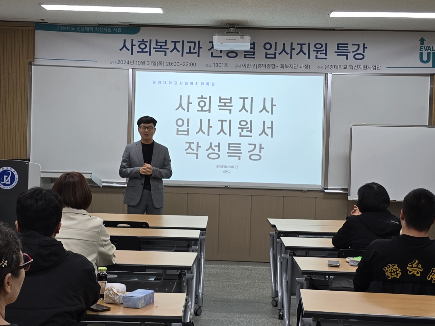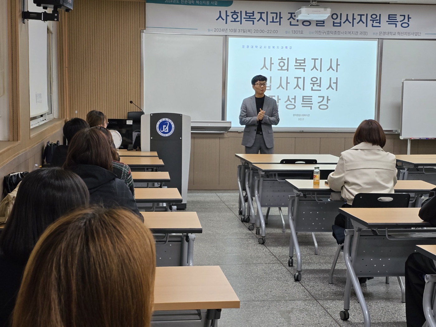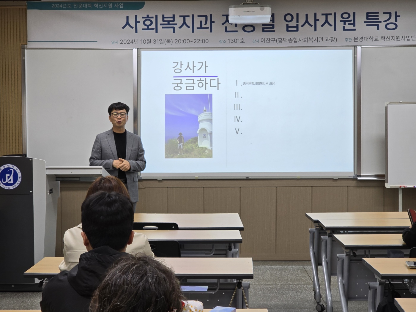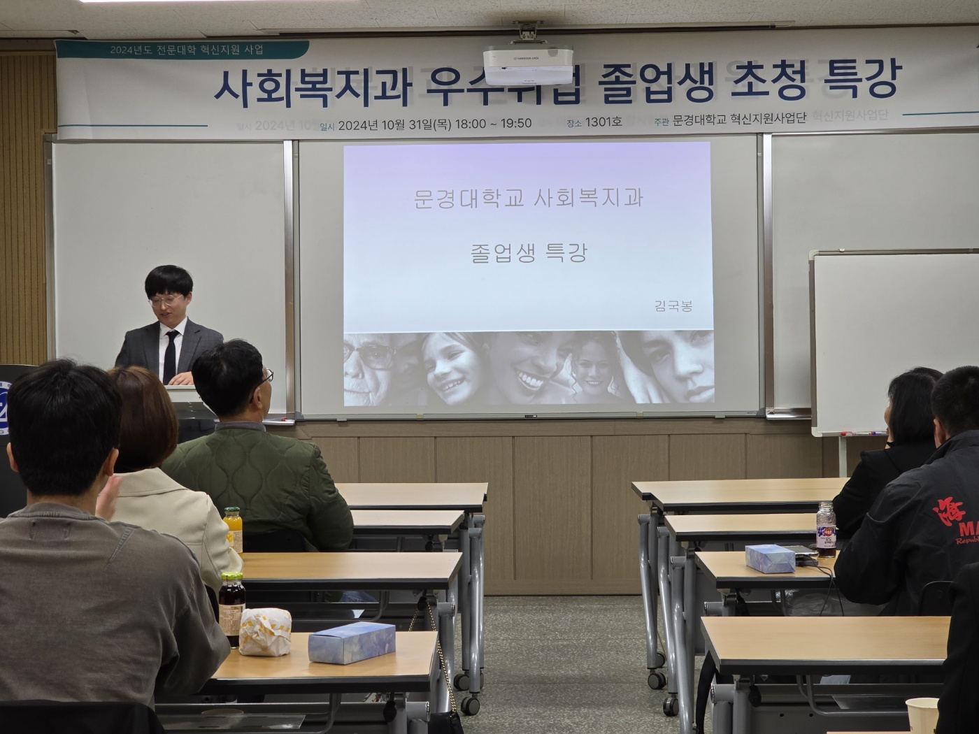 졸업생 특강을 2024년 2월에 졸업하여 현재 상주가정문제상담소에서 상담원으로 근무하고 있는 김국봉 졸업생이 학창시설 학교생활과 취업준비 과정 등 자신의 경험담을 후배들에게