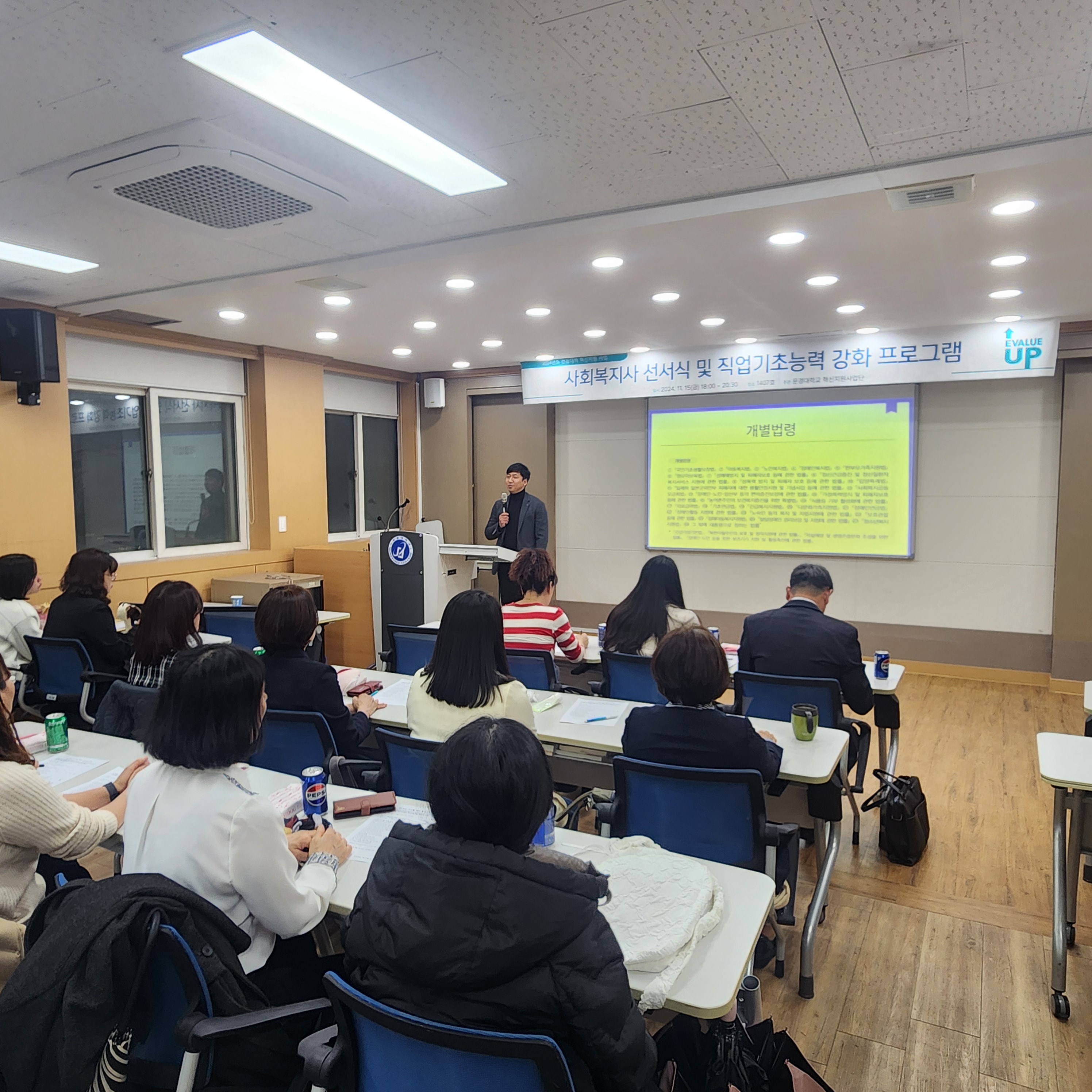 직업기초능력 강화를 위한 특강은 미오림복지재단 사랑마을 장성은 국장이 산업현장에서 누구나 갖추어야 할 직업기초능력 중에서 조직이해능력에 대하여 사회복지조직의 특징과 타 조직과의 차이점 등의 내용을 교육함으로써 예비사회복지사로서 사회복지조직을 이해하는데 많은 도움이 되었다.