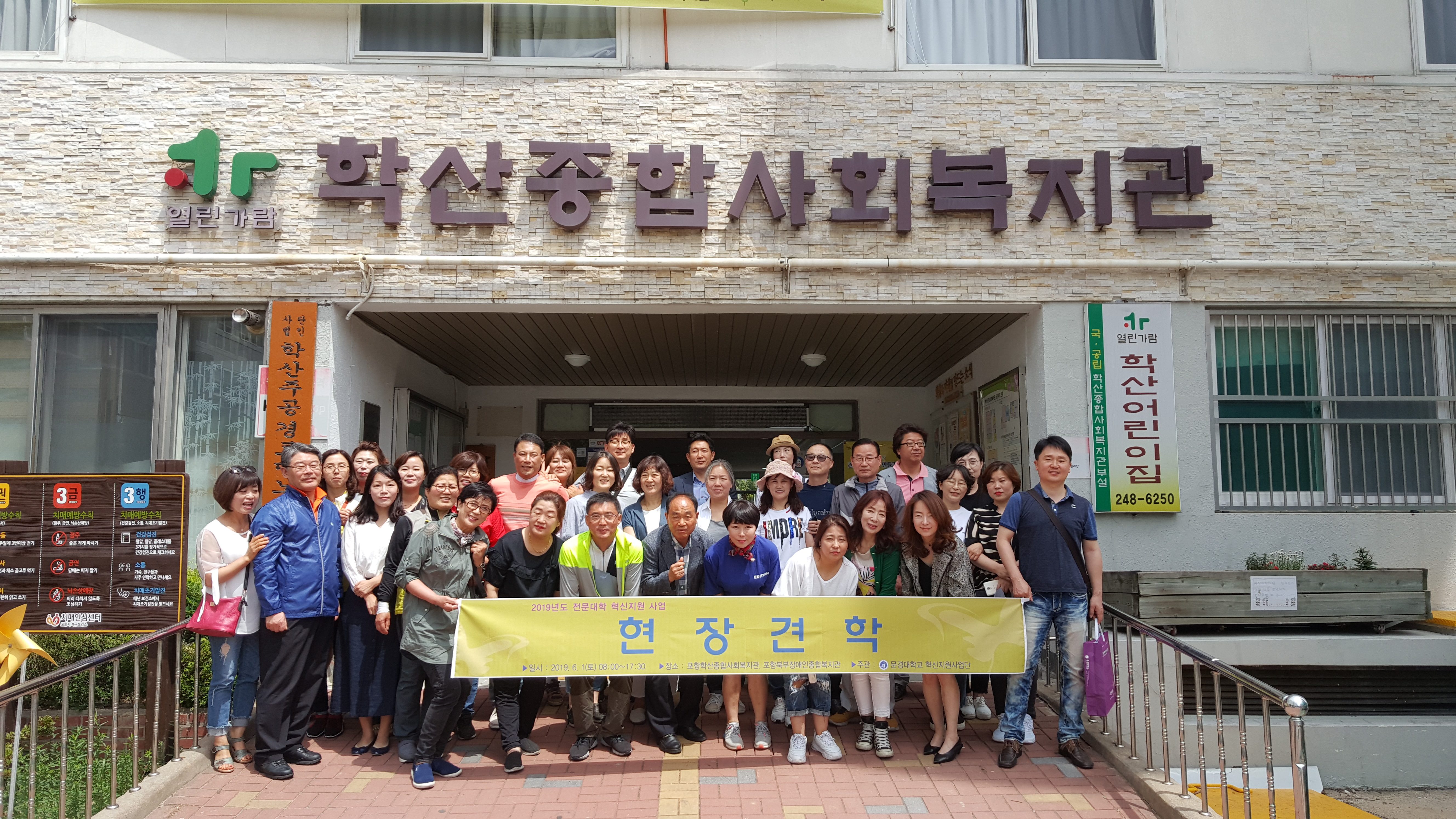 2019년 6월 1일(토) 사회복지과 1~2학년은 경북 포항에 있는 학산종합사회복지관과 포항북부장애인종합복지관을 방문하여 기관소개 및 서비스 제공 등 기관에 대한 설명을 듣고 복지관 시설투어를 갖졌다. 학생들은 현장견학을 통하여 강의실에서 이론으로 배웠던 사회복지에 대한 현장지식을 습득하는 계기가 되었다.